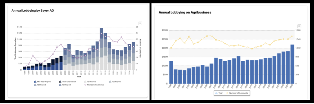 Bayer’s direct lobbying spending is significant, but its political influence expands considerably when viewed alongside allied trade and commodity groups that together form a well-financed and coordinated lobbying network. In 2025, Bayer retained at least 13 lobby firms and at least 49 registered lobbyists registered to lobby for the company (including Bayer’s six in-house lobbyists) as of the fourth quarter, federal disclosures show.