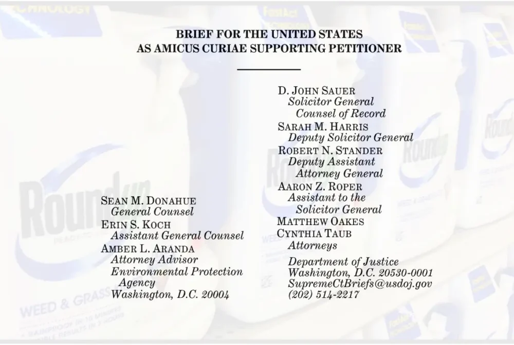 The brief was also signed by Robert N. Stander, deputy assistant attorney general in the DOJ’s Environment and Natural Resources Division. He spent roughly a decade at Jones Day, a firm that represented Bayer in matters related to its acquisition of Monsanto.